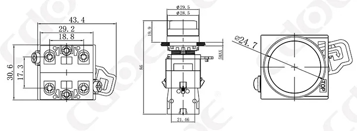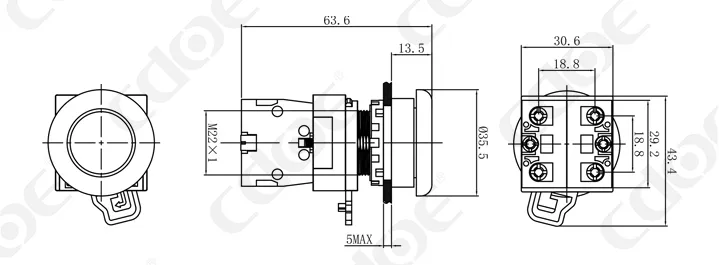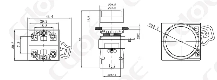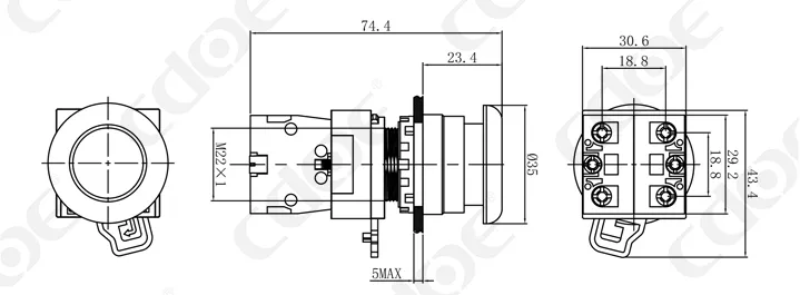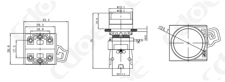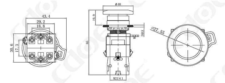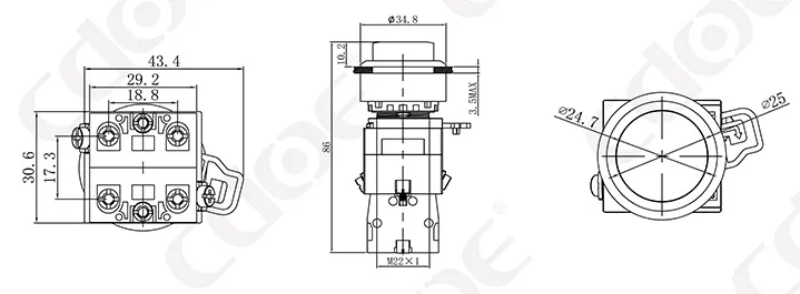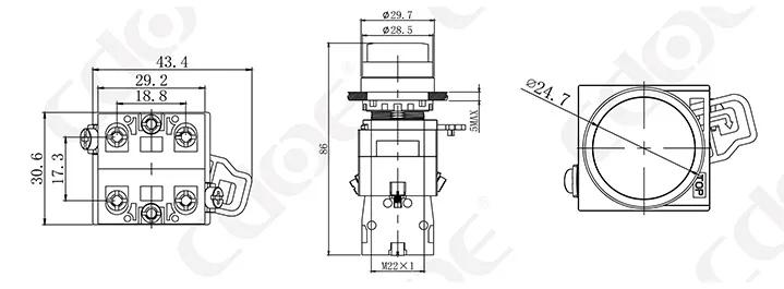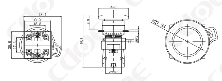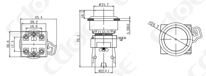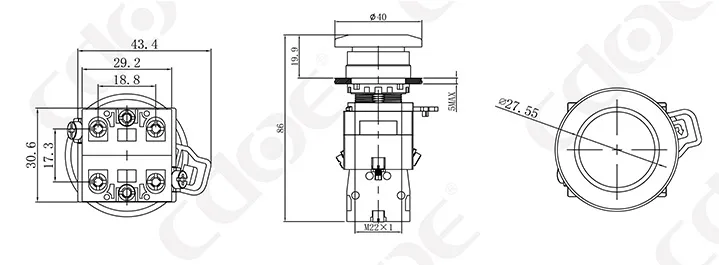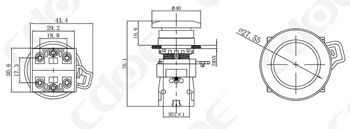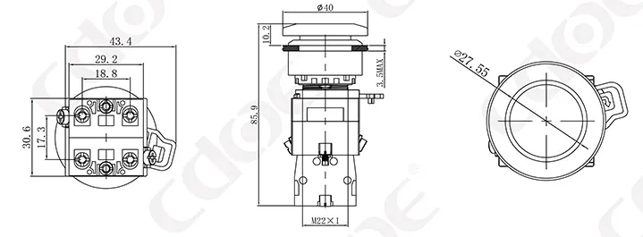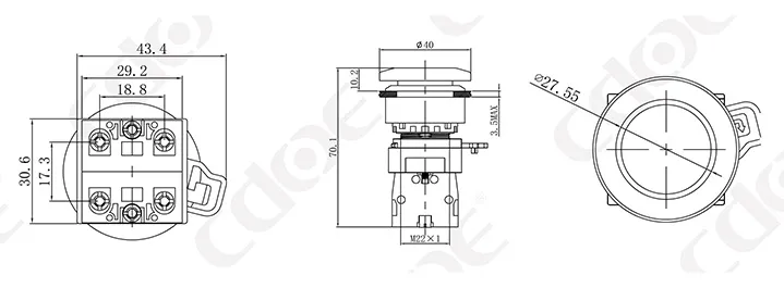 Размер монтажных отверстий: 22 мм/30 мм Тип клемм: винтовая клемма Материал корпуса: пластик/хромированная латунь Тип проведения: мгновенное проведение (сброс), фиксация (с фиксацией). Комбинированный контакт: 1НО/1НЗ/1НО1НЗ (поддерживаются свободные наложенные контакты) Тип головки: высокая головка/грибовидная головка |