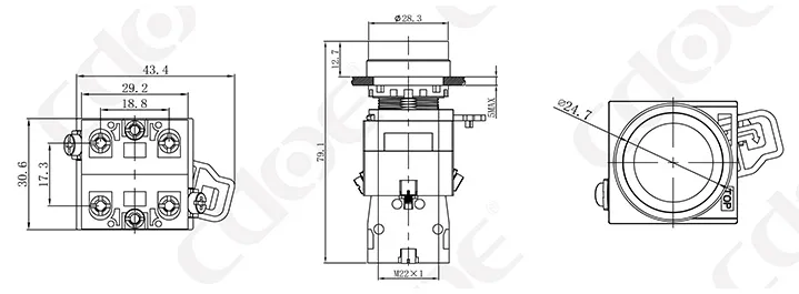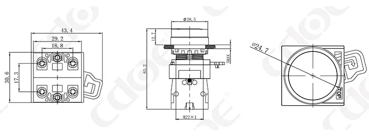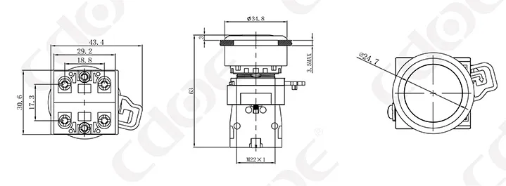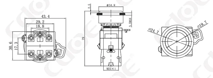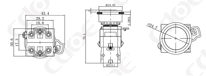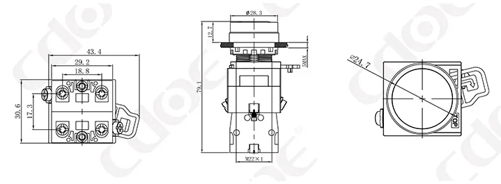 Размер монтажных отверстий: 22 мм/30 мм Тип клеммы: винтовая клемма Материал корпуса: хромированная латунь. Тип проведения: мгновенное проведение (сброс), фиксация (с фиксацией). Комбинированный контакт: 1НО/1НЗ/1НО1НЗ (поддерживаются свободные наложенные контакты) Тип головки: плоская круглая головка, головка с кольцевой панелью, головка с пользовательским символом. |