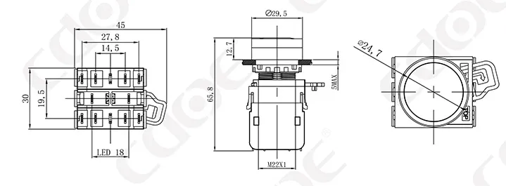 Размер монтажных отверстий: 22 мм Номинал переключателя: 10А/400В, 20А/400В Комбинация контактов: 1NO1NC,2NO2NC Тип операции: Кратковременная, Фиксация Тип клеммы: Штыревая клемма Материал корпуса: Пластик/Хромированная латунь Тип головки: Плоская головка, Высокая головка, Грибовидная головка, Головка с кольцевой светодиодной подсветкой |